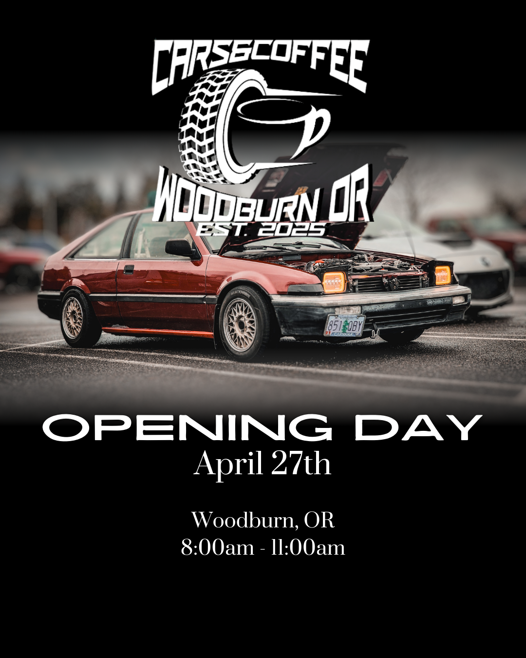Opening Day is set! Our very first Cars and Coffee will be held Sunday, April 27, 2025 at 8 am and ending at 11 am. Cars and Coffee Woodburn will take place Sundays from 8 am to 11 am. Theme days will be held every other week, and in the future we aim to build a few of the themes into something a bit bigger with awards and more.